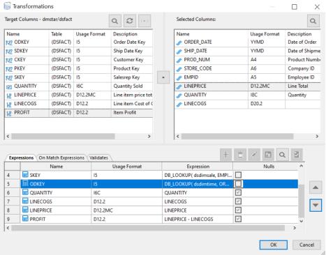 The identically named source and target column names are added to the Expressions window. The Transformations window should now look like the following image.