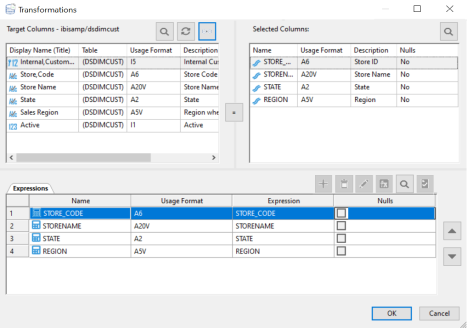 Note: The columns CKEY and ACTIVE are not mapped because these columns are handled automatically by the ibi Data Migrator Slowly Changing Dimension processing. CKEY is the surrogate key, which automatically starts with a value of 1 and increases by one, for each row added. The Active flag is set to 1 for currently active rows.Click OK to close the Transformations window.