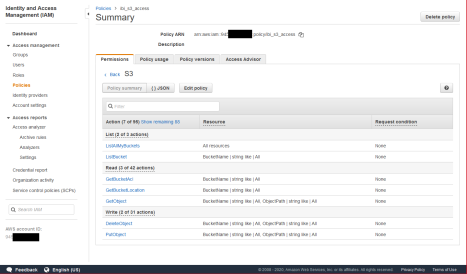 The minimum permission actions needed for S3 are ListAllMyBuckets, ListBucket, GetBucketACL, GetBucketLocation, GetObject, DeleteObject, and PutObject, as shown in the following image.