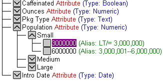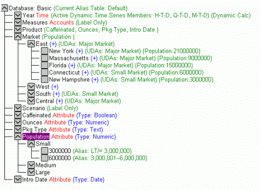An attribute dimension is identified by the word Attribute, which appears next to the Dimension name in the Essbase outline. Attribute dimensions are usually associated with standard Essbase dimensions. For example, in the following outline, Population is an Attribute dimension associated with the standard dimension Market.