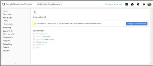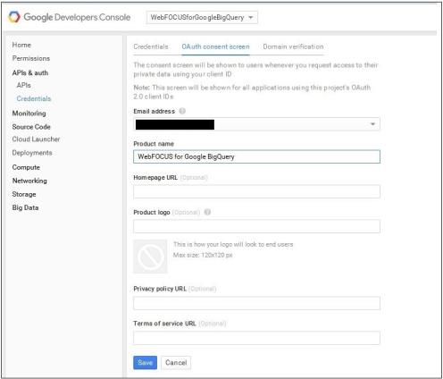 - Enter the Product Name that will appear on the Consent Screen, which will appear when you configure the Google BigQuery Adapter.