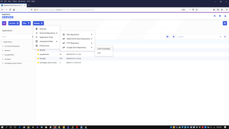 - From the Application view of the WebFOCUS Reporting Server browser interface, click Manage, then External Repository, then Google Drive Repository, then Link to Existing, as shown in the following image.