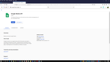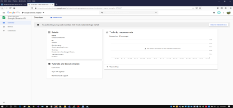 The Google Sheets API page opens showing Usage information, as shown in the following image.