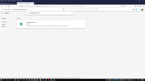 - In the Search box, enter Google Sheets API and select it from the search results, as shown in the following image.