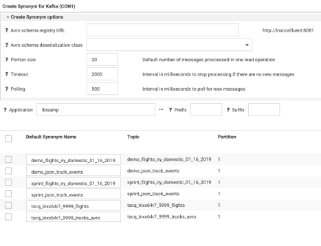 Using synonyms allows an object to be moved or renamed while enabling client applications to continue functioning without modification. The only modification required is a redefinition of the synonym on the server. The result of creating a synonym is a Master File and Access File based on a given Kafka topic.