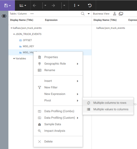 - Pivot the field containing the message values by right-clicking the field, clicking Pivot, and clicking Multiple values to columns, as shown in the following image.