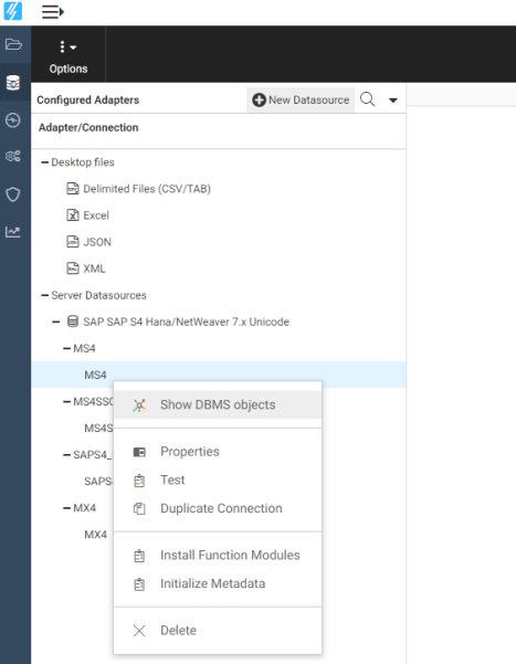 for SAP ECC or SAP S/4HANA has not yet been configured, click New Datasource. Select the ERP group, right-click SAP, click a version of SAP, then click Configure.