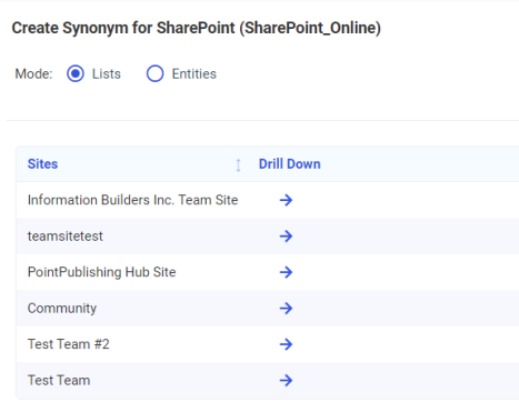 - To create a synonym for a particular SharePoint List, click the Drill Down arrow next to the site.