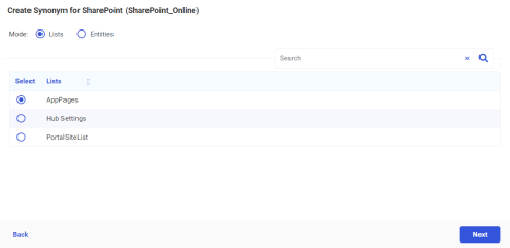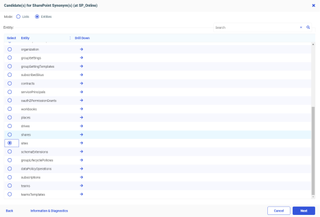 - Entities Mode Instructions. If you selected Entities mode to create a synonym for a particular SharePoint Entity, the Candidate(s) for SharePoint Synonym(s) page opens, as shown in the following image.