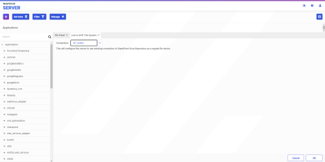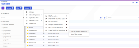 - From the Application page of the WebFOCUS Reporting Server browser interface, click Manage, point to External Repository, then SharePoint Drive Repository, and click Link to Existing, as shown in the following image.