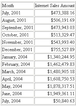 TABLE FILE adventure_works_mixed_case SUM Internet_Sales_Amount BY Month WHERE Calendar_Year EQ 'CY 2001' OR 'CY 2004' ON TABLE SET PAGE-NUM OFF ON TABLE NOTOTAL ON TABLE SET HTMLCSS ON END