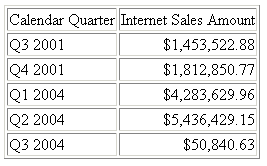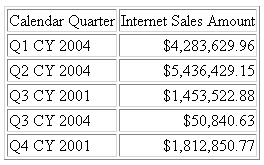 TABLE FILE adventure_works_mixed_case SUM Internet_Sales_Amount BY Calendar_Quarter WHERE Calendar_Year EQ 'CY 2001' OR 'CY 2004' ON TABLE SET PAGE-NUM OFF ON TABLE NOTOTAL ON TABLE SET HTMLCSS ON END