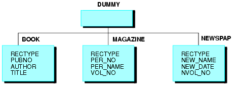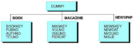 Note the difference between the use of the RECTYPE here and its use when the records are positionally related. In this case, the codes are unrelated and the database designer has chosen to accumulate the records by type first (all the book information together, all the magazine information together, and all the newspaper information together), so the RECTYPE may be the initial part of the key.