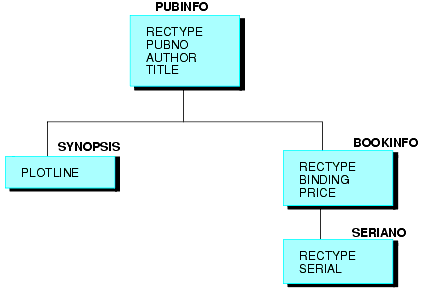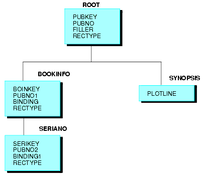 In the sample data source, the repetition of the publisher number as PUBNO1 and PUBNO2 in the descendant segments interrelates the three types of records. The data source can be diagrammed as the following structure: