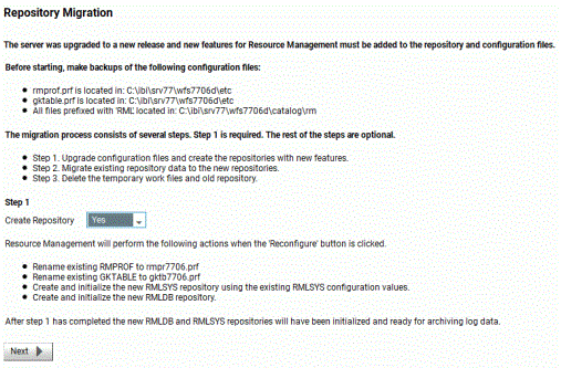 The Resource Management Migration pane opens. The sequence of panes is slightly different depending on the repository type.