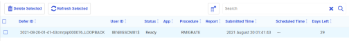 The Deferred List pane opens, displaying the list of deferred requests, and showing the request name that was displayed when the deferred migration job was scheduled. Examples of request names are listed in the Defer ID column, as seen in the following image.