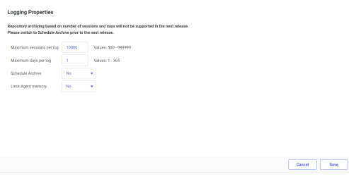 When set to Yes, only the Limit Agent memory option for interim log records is shown and the administrator has to configure the schedule archive settings. For more information, see Resource Management Configuration Maintenance.