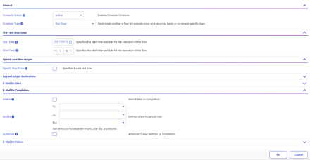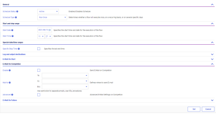 Allows you to specify an end date and time for the execution of the process flow. This option is only available if the schedule type is set to Recurring or Multi-Day.