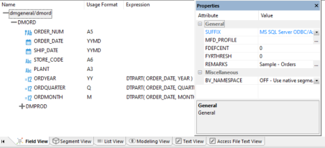 The values for Usage Format, Expression, Description, and Nulls are viewable in the hierarchy with the columns. To edit these values, use the corresponding attribute fields in the Properties pane on the right-hand side of the Synonym Editor.