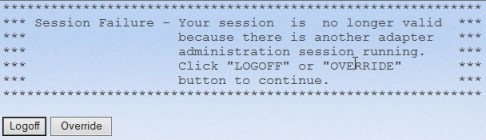 If there is no other legitimate administrator session, click the Override button. Otherwise, click the Logoff button to end your adapter session. If you select to override the other session, that session will now become invalid.