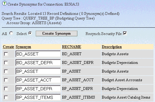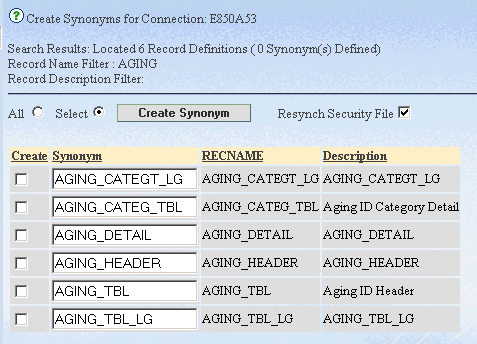 - Click Create Synonym to process. Processing may take a few minutes for each selected Record Definition.