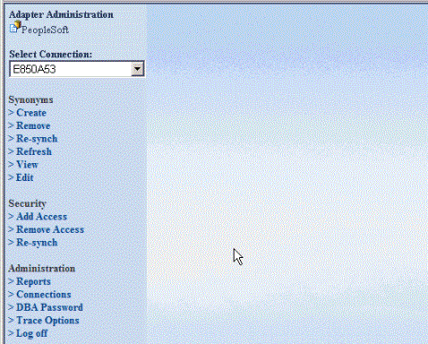 - From the PeopleSoft menu, select the connection you want to manage from the Select Connection drop-down menu. For details on accessing the PeopleSoft menu, see Accessing the Adapter for PeopleSoft Administrator.