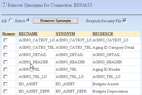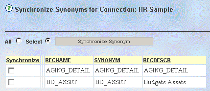 - Select the checkbox in the Synchronize column for each synonym you want to re-synchronize with PeopleSoft Record Definitions, or select All to check all listed synonyms.