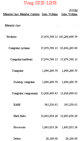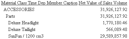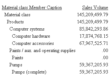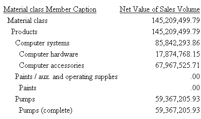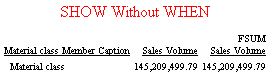 TABLE FILE TIMEDEP SUM NET_VALUE_OF_SALES_VOLUME BY MATERIAL_CLASS_CAPTION HIERARCHY SHOW TO DOWN 3 ON TABLE SET PAGE NOPAGE ON TABLE SET STYLE * GRID=OFF, $ END