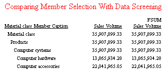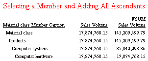 Hierarchical Context. The set of members selected for the report using a WHEN test is augmented so that every member of the hierarchy is shown within its hierarchical context. The displayed subtree of hierarchy members is a contiguous tree whose root is the root of the whole hierarchy. The added context members are shown without totals.