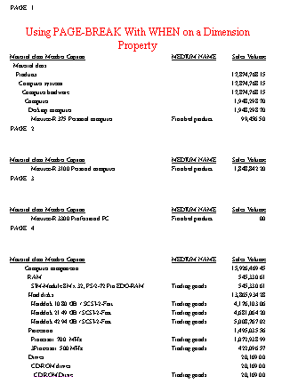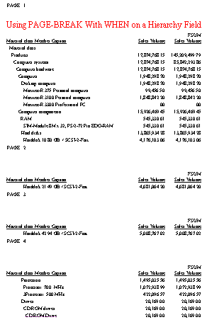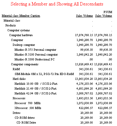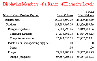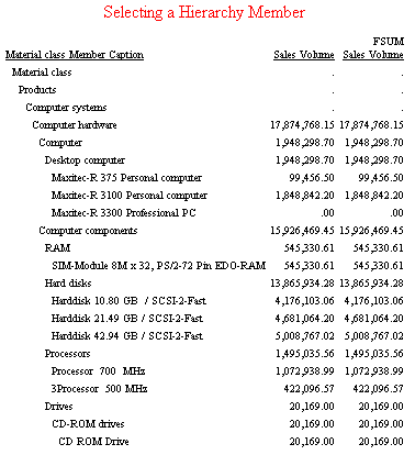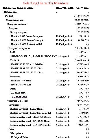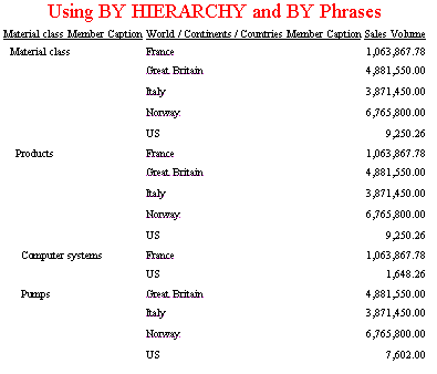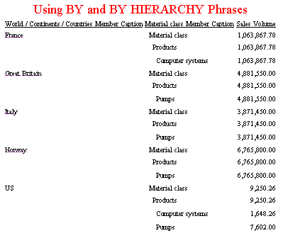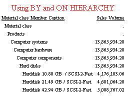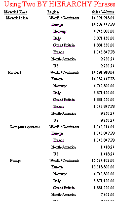The first phase selects hierarchy members to display. The hierarchical reporting phrase BY or ON HIERARCHY automatically sorts and formats a hierarchy with appropriate indentations that show the parent/child relationships. If you do not want to see the entire hierarchy, you can use the WHEN phrase to select hierarchy members for display. The expression in this WHEN phrase must reference only hierarchy fields, not dimension properties or measures.