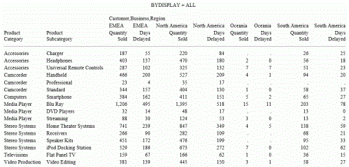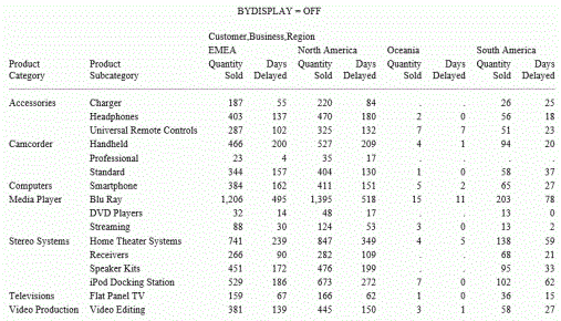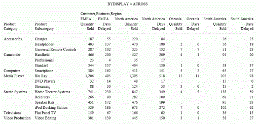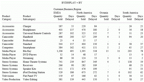 Changing BYDISPLAY to ALL displays BY field values on every row and ACROSS field values over every column, as shown in the following image.