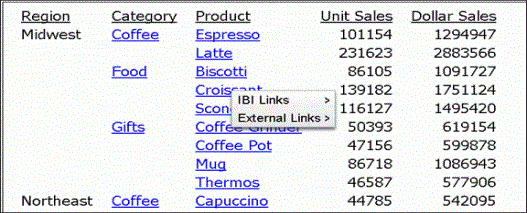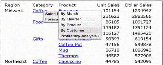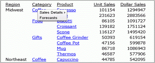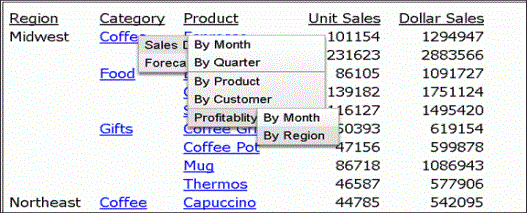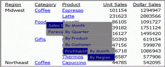 Note: As of Release 8.2 Version 01, when the Multi-Drill and On Demand Paging features are enabled in a report, the cascading Multi-Drill menus do not display. Instead, the legacy Multi-Drill menus generated prior to Release 8.2.01 will be generated. Cascading menus are not available and all hyperlinks display on the same level on the menu.