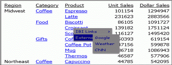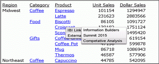 The multi-drill feature supports multiple menu items, as well as multiple cascading levels, that you can incorporate into any WebFOCUS report that works with JavaScript (for example, HTML and DHTML). Styling of the menu can be customized using WebFOCUS StyleSheet syntax.