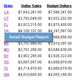 When you run the summary report, the State field is in red instead of blue whenever budget dollars is greater than dollar sales, and the pop-up menu of drill-down options shows Detail Budget Report instead of DrillDown 1 and DrillDown 2.