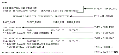The following code and output examples illustrate where a report heading (TABHEADING), a page heading (HEADING), a sort heading (SUBHEAD), a sort footing (SUBFOOT), and a report footing (TABFOOTING) are in a report, and which TYPE values you use to identify them.