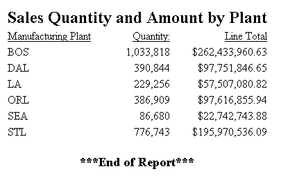 TABLE FILE CENTORD HEADING "Sales Quantity and Amount by Plant" SUM QUANTITY LINEPRICE BY PLANT ON TABLE SUBFOOT " " "***End of Report***" ON TABLE SET PAGE-NUM OFF ON TABLE SET STYLE * TYPE=REPORT, GRID=OFF, $ TYPE=HEADING, FONT=TIMES, SIZE=12, STYLE=BOLD,$ TYPE=TABFOOTING, JUSTIFY=CENTER, STYLE=BOLD, SIZE=11,$ ENDSTYLE END