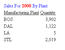 TABLE FILE CENTORD HEADING "Sales For <YEAR By Plant" SUM QUANTITY BY PLANT WHERE YEAR EQ 2000 ON TABLE SET PAGE-NUM OFF ON TABLE SET STYLE * TYPE=REPORT, GRID=OFF, $ TYPE=HEADING, OBJECT=TEXT, COLOR=BLUE,$ TYPE=HEADING, OBJECT=FIELD, COLOR=RED, STYLE=BOLD,$ ENDSTYLE END