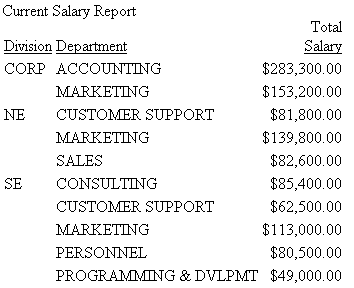 TABLE FILE EMPDATA SUM SALARY AS 'Total,Salary' BY DIV AS 'Division' BY DEPT AS 'Department' WHERE DIV EQ 'NE' OR 'SE' OR 'CORP' HEADING "Current Salary Report" ON TABLE SET STYLE * TYPE=REPORT,GRID=OFF,$ ENDSTYLE END