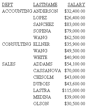 TABLE FILE EMPDATA SUM SALARY BY DEPT BY LASTNAME WHERE DEPT IS 'SALES' OR 'CONSULTING' OR 'ACCOUNTING' ON TABLE SET PAGE-NUM OFF ON TABLE SET STYLESHEET * TYPE=REPORT, GRID=OFF, $ ENDSTYLE END