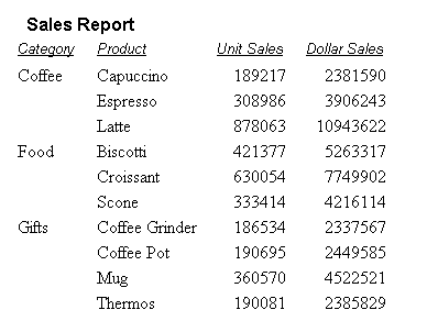 This request uses a StyleSheet to select 12-point Arial bold for the report heading (Sales Report), and 10-point Arial italic for the default column titles (Category, Product, Unit Sales, Dollar Sales), based on the HTML point scale, which differs from standard point sizes. See Formatting Report Data.