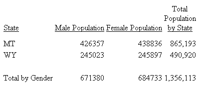 TABLE FILE GGDEMOG PRINT MALEPOP98 FEMPOP98 ROW-TOTAL/C/D12 AS 'Total,Population,by State' BY ST WHERE (ST EQ 'WY' OR 'MT') ON TABLE COLUMN-TOTAL AS 'Total by Gender' ON TABLE SET PAGE-NUM OFF ON TABLE SET ONLINE-FMT HTML ON TABLE SET STYLESHEET * TYPE = REPORT, GRID=OFF, $ ENDSTYLE END