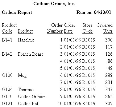 TABLE FILE GGORDER HEADING " <+0>Gotham Grinds, Inc." " " "Orders Report <+0> <+0> Run on: &DATE" " " PRINT ORDER_NUMBER ORDER_DATE STORE_CODE QUANTITY BY PRODUCT_CODE BY PRODUCT_DESCRIPTION IF RECORDLIMIT EQ 10 ON TABLE SET PAGE-NUM OFF ON TABLE SET ONLINE-FMT HTML ON TABLE SET STYLESHEET * TYPE = REPORT, GRID = ON, $ TYPE = HEADING, HEADALIGN = INTERNAL, STYLE = BOLD, $ ENDSTYLE END