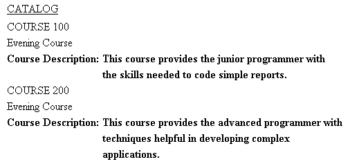 TABLE FILE TXTFLD BY DESCRIPTION AS 'CATALOG' SUBFOOT "Evening Course" "Course Description: <TEXTFLD" ON TABLE SET PAGE-NUM OFF ON TABLE SET ONLINE-FMT HTML ON TABLE SET STYLESHEET * TYPE = REPORT, GRID = OFF, $ TYPE = SUBFOOT, HEADALIGN = BODY, $ TYPE = SUBFOOT, LINE = 2, STYLE = BOLD, $ ENDSTYLE END