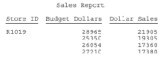 SET ONLINE-FMT=PDF TABLE FILE GGSALES PRINT BUDDOLLARS DOLLARS BY STCD WHERE BUDDOLLARS GE 25000 WHERE STCD EQ 'R1019' ON TABLE SUBHEAD "Sales Report" " " ON TABLE SET PAGE-NUM OFF ON TABLE SET SQUEEZE ON ON TABLE SET STYLESHEET * TYPE = TABHEADING, POSITION = 1.25, $ ENDSTYLE END