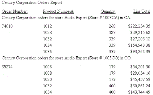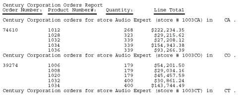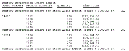 TABLE FILE CENTCOMP HEADING "Century Corporation Orders Report </1" PRINT PROD_NUM QUANTITY LINEPRICE BY STORE_CODE NOPRINT BY ORDER_NUM ON STORE_CODE SUBHEAD "Century Corporation orders for store <STORENAME <0X (store # <STORE_CODE<-1 ) in <STATE|.</1" ON TABLE SET STYLE * TYPE=REPORT, GRID=OFF, $ ENDSTYLE END