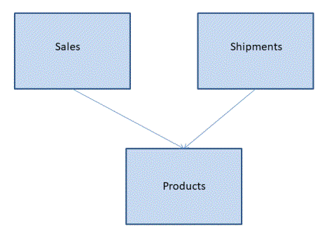 Reporting against multiple root segments and a shared dimension generates multiple contexts in a cluster synonym. For example, in the following image Sales and Products form one context, while Shipments and Products form a second context.