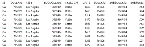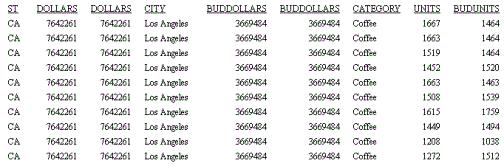 SET MATCHCOLUMNORDER = UNGROUPED MATCH FILE GGSALES SUM DOLLARS BY ST SUM BUDDOLLARS BY ST BY CITY PRINT UNITS BY ST BY CITY BY CATEGORY RUN FILE GGSALES SUM DOLLARS BY ST SUM BUDDOLLARS BY ST BY CITY PRINT BUDUNITS BY ST BY CITY BY CATEGORY AFTER MATCH HOLD OLD-OR-NEW END TABLE FILE HOLD PRINT * ON TABLE SET PAGE NOLEAD ON TABLE SET STYLE * TYPE=REPORT, GRID=OFF, SIZE=9,$ ENDSTYLE END