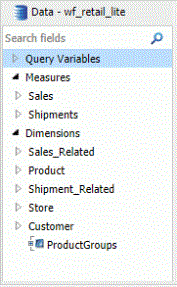 The Data pane contains the data fields that are used to construct reports, charts, or visualizations. The default structure of data in the Data pane displays your data by field type, for example, measure field or dimension field. You can explore this structure using the sample retail database that is included with WebFOCUS InfoAssist. The structure of this sample database, which is a cube database, includes measure groups, measure fields, dimension hierarchies, dimension fields, and attributes.