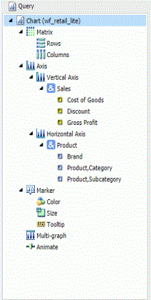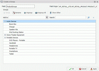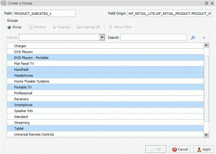 Dynamic grouping allows you to create groups of elements based on the field data type that you select. For example, in the wf_retail_lite database, there are a number of brands of televisions. Using the dynamic grouping functionality, you can create groups based on the popularity of a particular brand. The first group might include top sellers such as LG and Sony. The second group might contain the remaining brands (Panasonic, GPX, Supersonic, Tivax, and Audiovox). This would allow you to group top sellers into one group, and the remaining brands into another group.