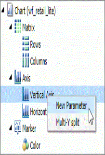 Allows you to add new parameters to your report or chart, which creates parameter options for selection at run time. You can create a new parameter in a report or chart in any field container. Note: When working with charts, a new parameter can only be added for charts that use the new attribute syntax. |